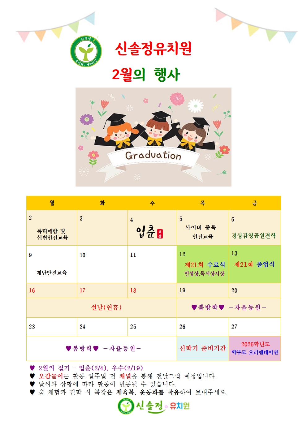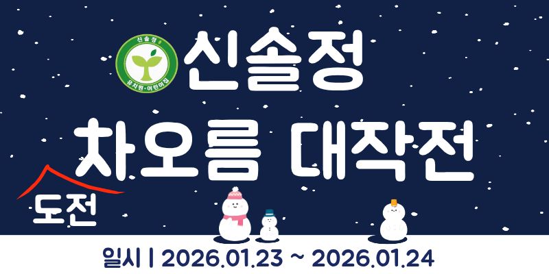 졸업생 공간 즐겁고 행복했던 신솔정에서의 추억, 영원히 간직하세요~ 자세히보기 유치원 공지사항 +more 3월 토요가족 체험안내(유아교육진흥원)~* 2025학년도 신솔정 새해복 많이받으세요! 2025학년도 졸업식 한국형 온라인 공개강좌(K-MOOC) 안내~* 26년 2월 가정통신문~* 식단표 +more 2025년 12월 23일 식단 2025년 12월 22일 식단 2025년 12월 19일 식단 2025년 12월 18일 식단 2025년 12월 17일 식단 자유게시판 +more 2025학년도 겨울방학 ▶절제◀ 2025학년도 여름방학 ▶동행◀ 나무반 김지안 겨울방학 방학동행책 새싹반 신이현 방학동행책+여름방학사진 은수아 신솔정유치원 2월 일정표 신솔정유치원 식단표 2월 건강식단 원아모집 소중한 우리아이들을행복한 어린이로 자라게 합니다. 자세히보기