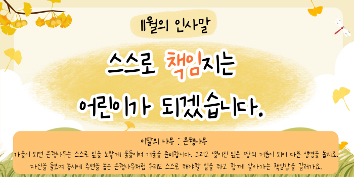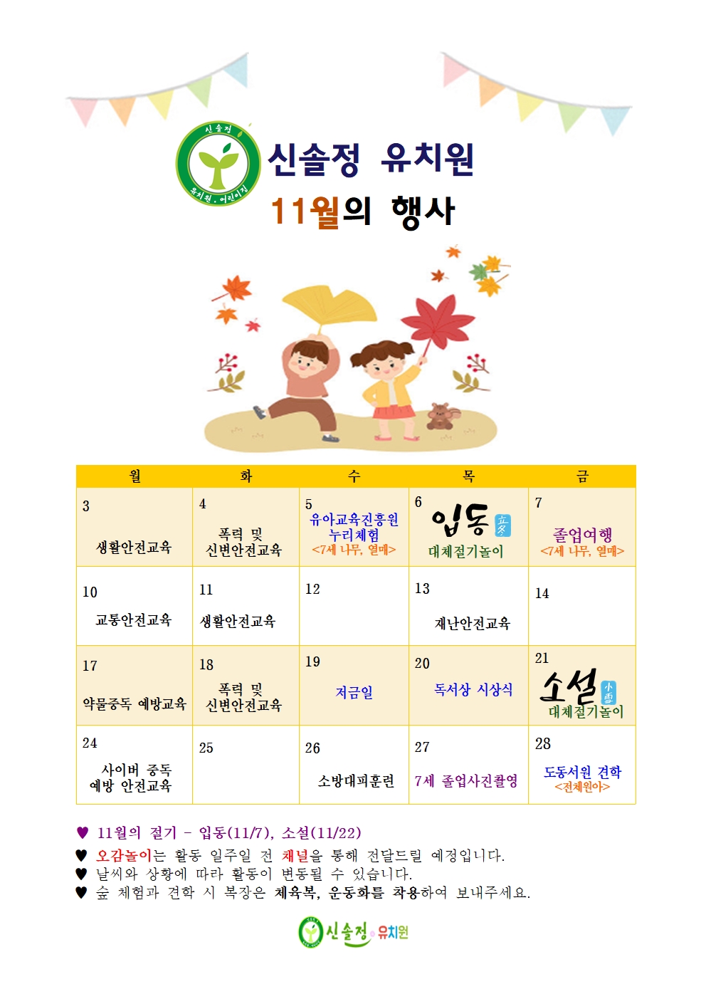 졸업생 공간 즐겁고 행복했던 신솔정에서의 추억, 영원히 간직하세요~ 자세히보기 유치원 공지사항 +more 유아기 자녀의 행복지수를 높이는 독서 교육 안내~* 2025학년도 한마음 영화회 인플루엔자 유행주의보가 발령 안내~* 2025학년도 11월 행사표 아이 발달 신호에 맞춘 양육 첫 걸음 부모교육 안내~* 식단표 +more 2025년 11월 3일 식단 2025년 10월 31일 식단 2025년 10월 30일 식단 2025년 10월 29일 식단 2025년 10월 28일 식단 자유게시판 +more 2025학년도 여름방학 ▶동행◀ 나무반 김지안 겨울방학 방학동행책 새싹반 신이현 방학동행책+여름방학사진 은수아 방학동행책 꽃잎반 신하린 신솔정유치원 11월 일정표 신솔정유치원 식단표 11월 건강식단 원아모집 소중한 우리아이들을행복한 어린이로 자라게 합니다. 자세히보기