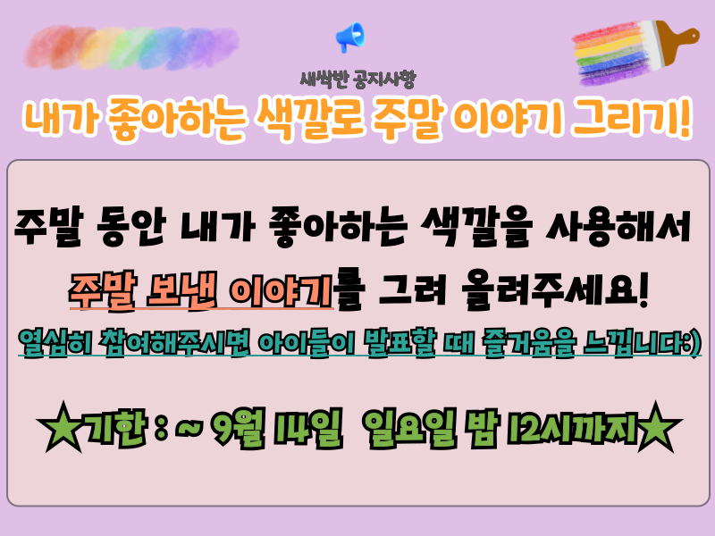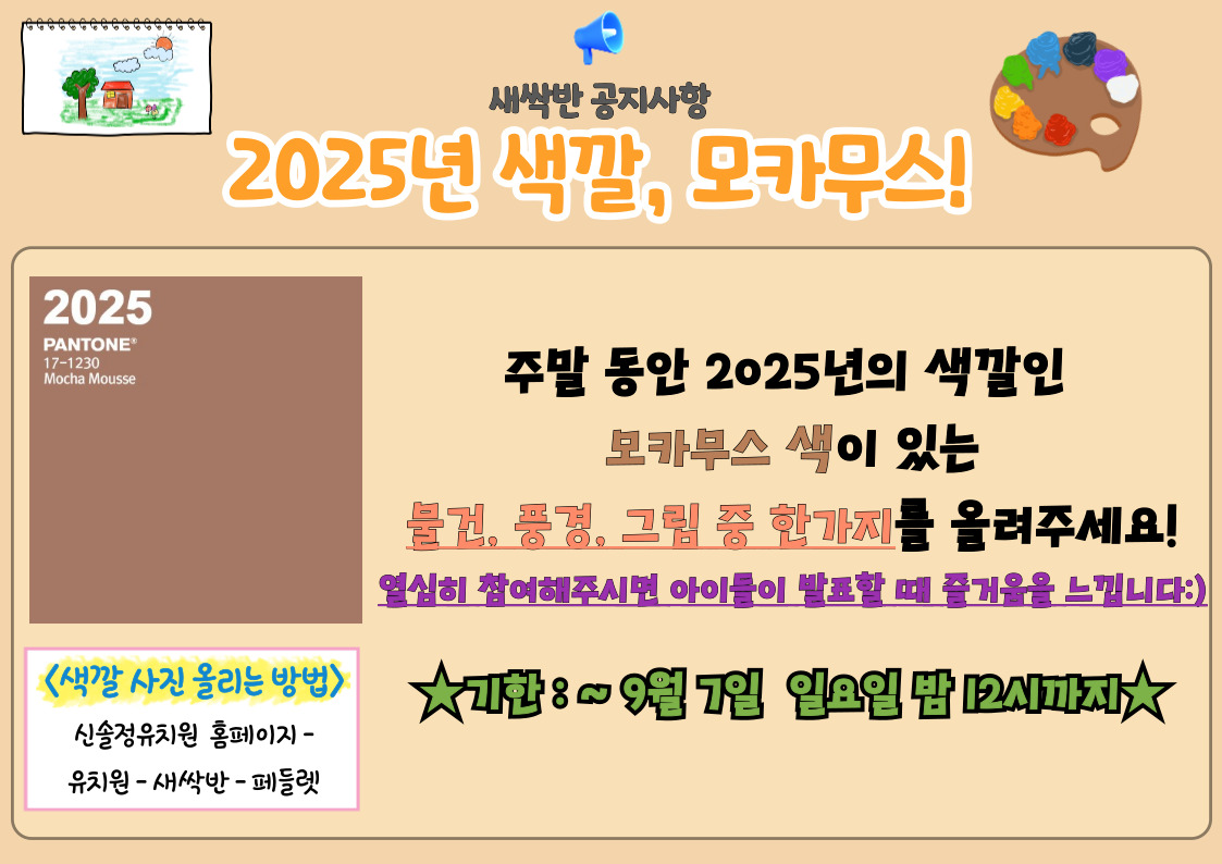 새싹반 담임교사 : 김예림 선생님 선생님 한말씀 [새싹반 공지사항] 안녕하십니까? 새싹반 학부모님들:) 이번 9월 1주 주말 놀이는 \"2025년의 색깔인 \'모카무스\'색이 담긴 물건, 풍경, 그림\"을 찍어서 페들렛에 사진을 올리는 것입니다:) 주말 동안 새싹이들과 함께 찾아보며, 간단한 설명과 함께 작성하여주시면 감사하겠습니다♥ 매 주 이루어진 주말 놀이를 적극적으로 참여해주셔서 감사합니다! 즐거운 주말 보내십시요 :) 우리반 앨범 주간 계획안 선생님과 함께 총수량 : 62 ♥사랑하는 우리 유원이의 5번째 생일파티♥ 김예림선생님♥ Hit : 2 (2025-10-05) 새싹이들의 추석 김예림 선생님 Hit : 7 (2025-10-05) 새싹이들의 추석 김예림 선생님 Hit : 6 (2025-10-05) ♥새싹이들의 화원자연휴양림♥ 김예림선생님♥ Hit : 3 (2025-09-29) ♥새싹이들의 절기, 추분♥ 김예림선생님♥ Hit : 6 (2025-09-23) ♥사랑하는 우리 서준이의 5번째 생일파티♥ 김예림선생님♥ Hit : 6 (2025-09-23) 새싹이들의 밧줄놀이 김예림선생님 Hit : 12 (2025-09-14) ♥새싹반의 9월 2주 주말 놀이♥ 김예림선생님♥ Hit : 2 (2025-09-12) ♥사랑하는 우리 유나의 5번째 생일파티♥ 김예림선생님♥ Hit : 7 (2025-09-11) ♥새싹이들의 절기, 백로♥ 김예림선생님♥ Hit : 10 (2025-09-08) ♥새싹이들의 오감놀이 _ 구름(솜)♥ 김예림선생님♥ Hit : 8 (2025-09-04) ♥새싹이의 9월 1주 주말 놀이♥ 김예림선생님♥ Hit : 4 (2025-09-04) 1 2 3 4 5 6 검색 전체보기 ---유치원 ------새싹반 ------풀잎반 ------나무반 ------열매반 제목 내용 작성자 검색