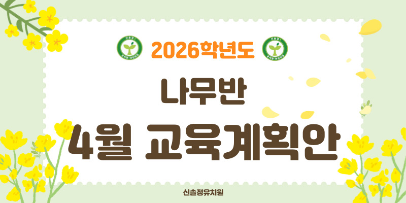 나무반 담임교사 : 박윤조선생님 선생님 한말씀 아이들이 ‘나’에서 ‘우리’로 자라나는 1년동안의 과정. 놀이 속에서 배려하고 기다리며 함께하는 기쁨을 배우는, 함께라서 더 단단해지는 나무들과 함께 하겠습니다:) Made with 우리반 앨범 주간 계획안 선생님과 함께 총수량 : 12 설렘 가득한, 봄 신솔정 Hit : 16 (2026-04-05) 나무들의 특색특성화! 신솔정 Hit : 16 (2026-04-05) 지한이의 7번쨰 생일~! 신솔정 Hit : 16 (2026-04-03) 2026학년도 4월 계획안 신솔정 Hit : 6 (2026-03-30) 우리 반 만의 이야기, 마스코트! 신솔정 Hit : 23 (2026-03-29) 3월의 요리맵시~! 신솔정유치원 Hit : 31 (2026-03-25) 통학버스 안전교육! 신솔정 Hit : 20 (2026-03-23) 수현이의 7번째 생일! 신솔정 Hit : 18 (2026-03-19) 우리들의 놀이 모음집:) 신솔정 Hit : 34 (2026-03-16) 나무반 3월 계획안 나무반선생님 Hit : 27 (2026-03-06) 서윤이의 7번째 생일!!! 나무반 선생님 Hit : 11 (2026-03-19) 우리들은 이렇게 놀아요! 신솔정유치원 Hit : 59 (2026-03-04) 1 검색 전체보기 ---유치원 ------새싹반 ------풀잎반 ------나무반 ------열매반 제목 내용 작성자 검색