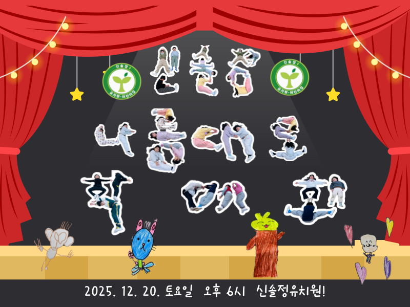 우리 나름의 놀이 총수량 : 1,202 전체보기 2025학년도 [도전] 차오름 캠프! 신솔정 Hit : 245 (2026-01-24) 나름대로 학예회 - 열매 신솔정 Hit : 120 (2026-01-13) 나름대로 학예회 - 나무 신솔정 Hit : 55 (2026-01-13) 나름대로 학예회 - 풀잎 신솔정 Hit : 29 (2026-01-13) 나름대로 학예회 - 새싹 신솔정 Hit : 61 (2026-01-13) 2025학년도 신솔정 크리스마스 캐롤 신솔정 Hit : 229 (2025-12-24) 7세(나무,열매)- 교통랜드 견학 신솔정 Hit : 149 (2025-11-25) 우리들의 놀이-밧줄 신솔정 Hit : 286 (2025-11-17) 우리들의 추억, 졸업여헹-나무.열매 신솔정유치원 Hit : 99 (2025-11-09) 있었다!! 없었다!! 깜짝 밧줄놀이터 신솔정 Hit : 256 (2025-10-27) 달성군 어린이 금식센터'꼬까미의 골고루 나라 뮤지컬 관람' 신솔정 Hit : 192 (2025-10-27) 함께 쓰는 놀이 기록전:) 신솔정 Hit : 85 (2025-10-22) 1 2 3 4 5 6 7 8 9 10 > >| 검색 전체보기 제목 내용 작성자 검색