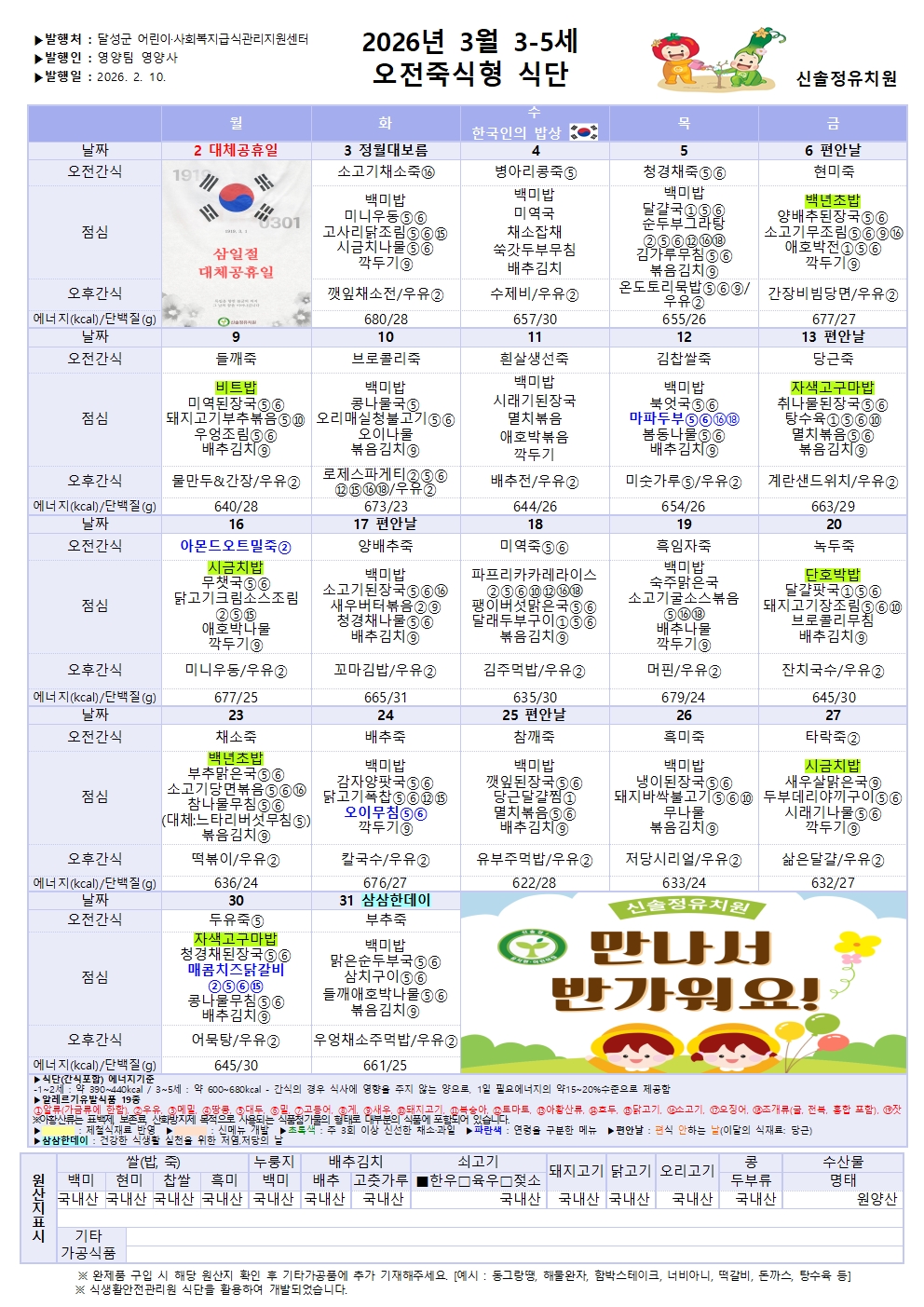 졸업생 공간 즐겁고 행복했던 신솔정에서의 추억, 영원히 간직하세요~ 자세히보기 유치원 공지사항 +more 3월 토요가족 체험안내(유아교육진흥원)~* 2025학년도 신솔정 새해복 많이받으세요! 2025학년도 졸업식 한국형 온라인 공개강좌(K-MOOC) 안내~* 26년 2월 가정통신문~* 식단표 +more 2026년 1월 26일 식단 2026년 1월 23일 식단(차오름캠프) 2026년 1월 22일 식단 2026년 1월 21일 식단 2026년 1월 20일 식단 자유게시판 +more 2025학년도 겨울방학 ▶절제◀ 2025학년도 여름방학 ▶동행◀ 나무반 김지안 겨울방학 방학동행책 새싹반 신이현 방학동행책+여름방학사진 은수아 신솔정유치원 식단표 3월 건강식단 원아모집 소중한 우리아이들을행복한 어린이로 자라게 합니다. 자세히보기