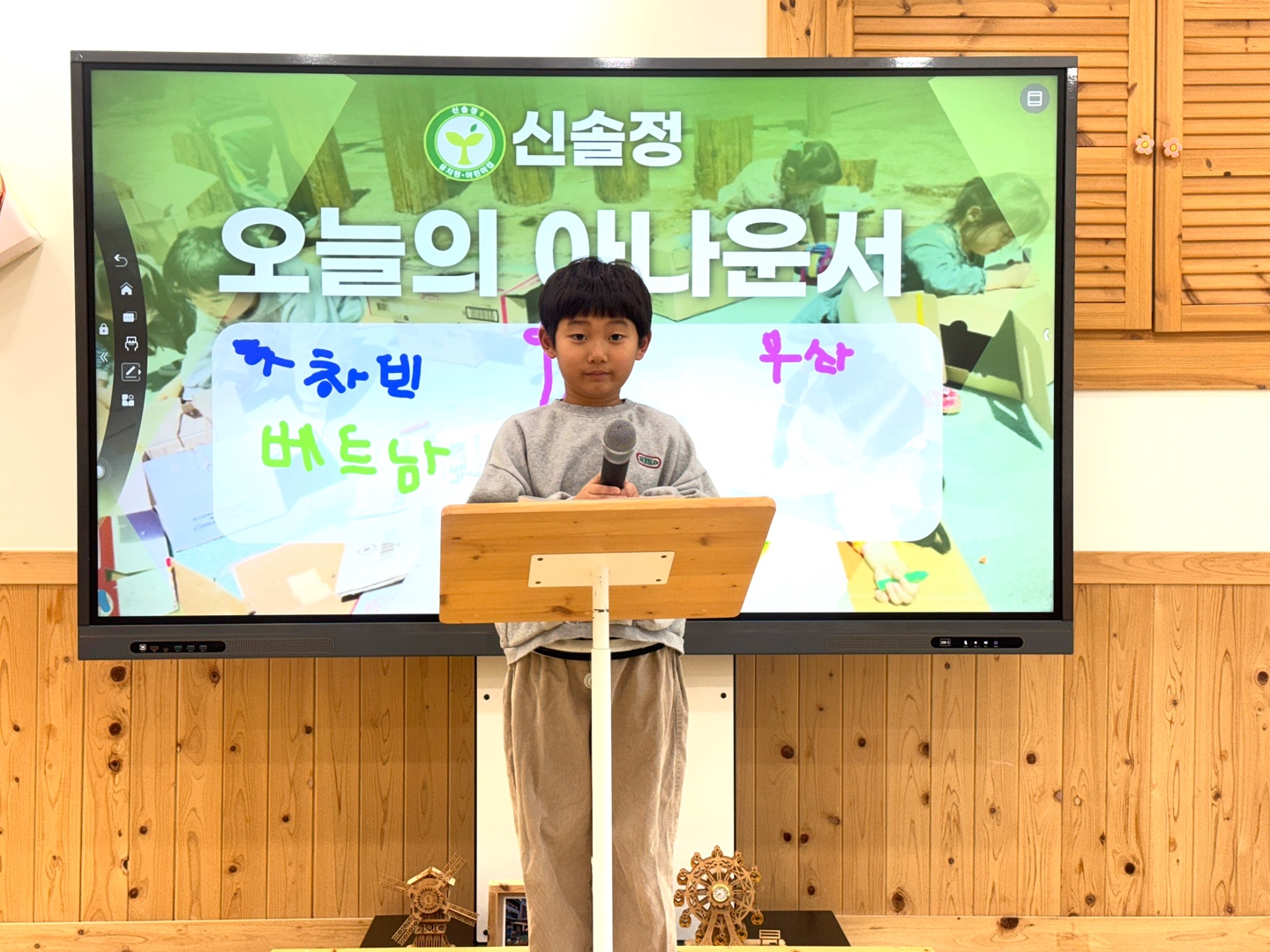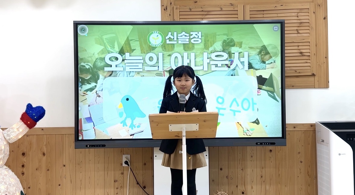 나무반 담임교사 : 박윤조 선생님 선생님 한말씀 작은 씨앗이 자라 든든한 나무가 되듯, 우리 아이들이 각자가 가진 개성을 하나로 모아 \'우리\'를 만들 수 있는 울타리가 되어주며 우리 나무들과 씩씩하고 든든하게 자라겠습니다! 우리반 앨범 주간 계획안 선생님과 함께 총수량 : 62 2025학년도 나무반 아나운서 황예건 신솔정 Hit : 3 (2026-01-27) 오랜만의 산책길:) 나무반선생님 Hit : 7 (2026-01-20) 2025학년도 나무반 아나운서 오혜인 신솔정 Hit : 6 (2026-01-13) 나름대로 학예회 - 국악 (느린 베토벤 바이러스) 신솔정 Hit : 5 (2026-01-12) 나름대로 학예회 - 챔피언 신솔정 Hit : 3 (2026-01-12) 나름대로 학예회 - 피아노(징글벨) 신솔정 Hit : 3 (2026-01-12) 나름대로 학에회 - 7세 발레 신솔정 Hit : 3 (2026-01-12) 2025학년도 나무반 하창빈 아나운서 신솔정 Hit : 6 (2026-01-12) 나름대로학예회 - 7세 합창 신솔정 Hit : 3 (2026-01-12) 2025학년도 나무반 은수아 아나운서 신솔정 Hit : 11 (2025-12-17) 2025학년도 나무반 이성윤 아나운서 신솔정 Hit : 10 (2025-12-17) 2025학년도 나무반 손재훈 아나운서 신솔정 Hit : 5 (2025-12-17) 1 2 3 4 5 6 검색 전체보기 ---유치원 ------새싹반 ------풀잎반 ------나무반 ------열매반 제목 내용 작성자 검색